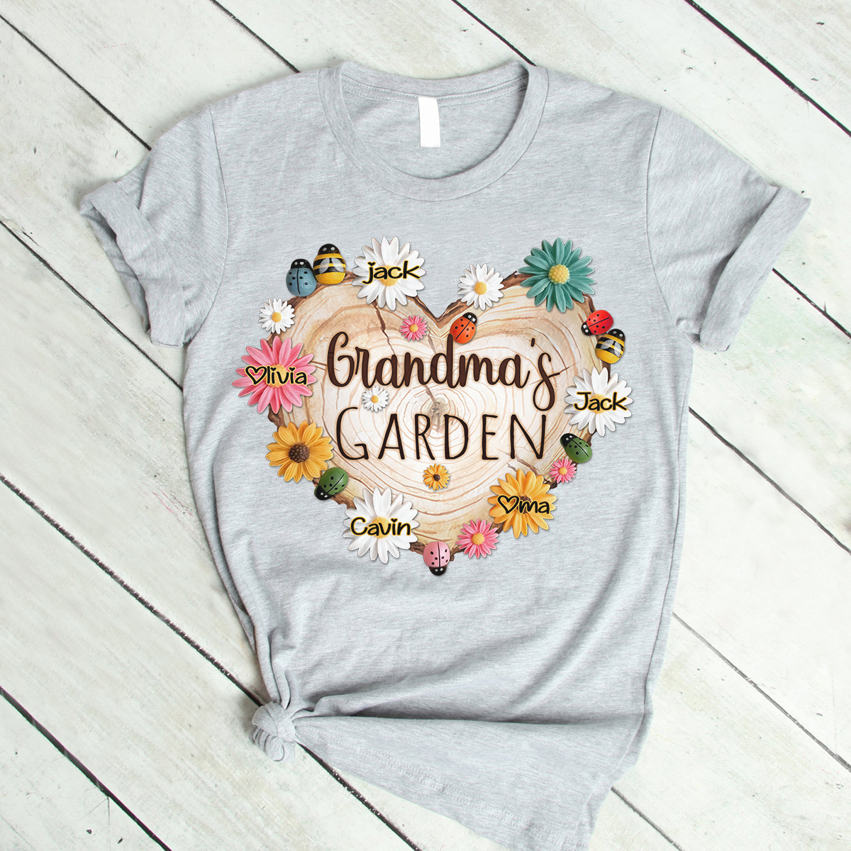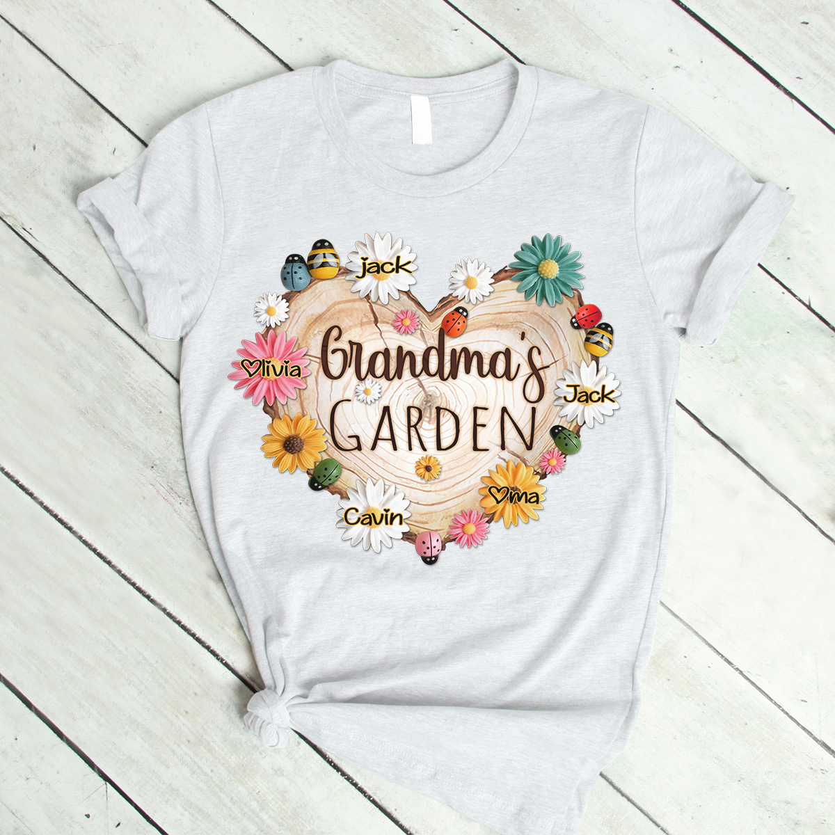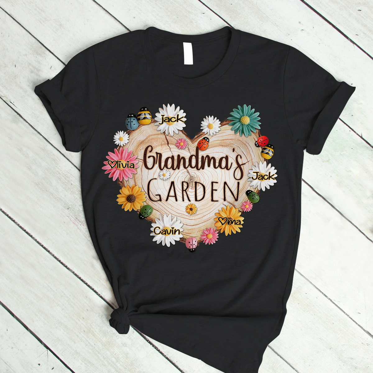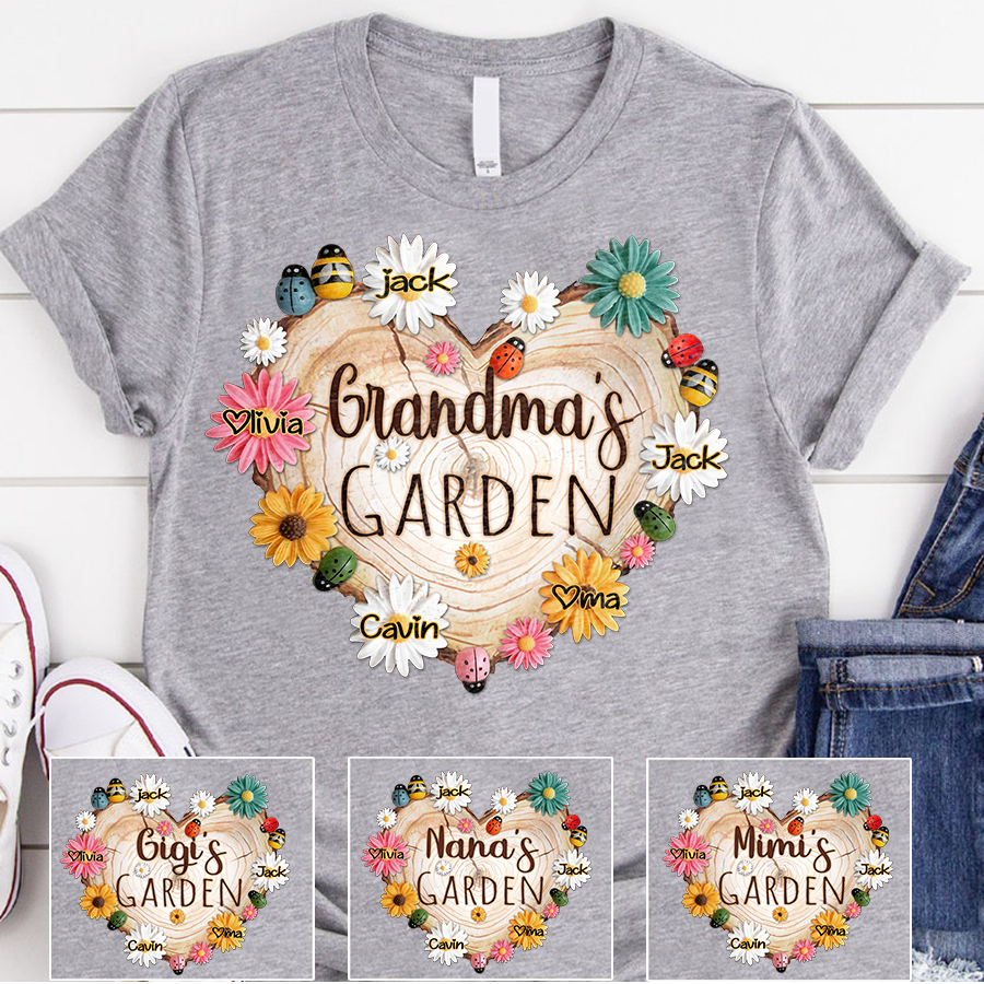 Personalized Grandma Garden With Grandkids Floral Ladybug And Bee T-Shirt