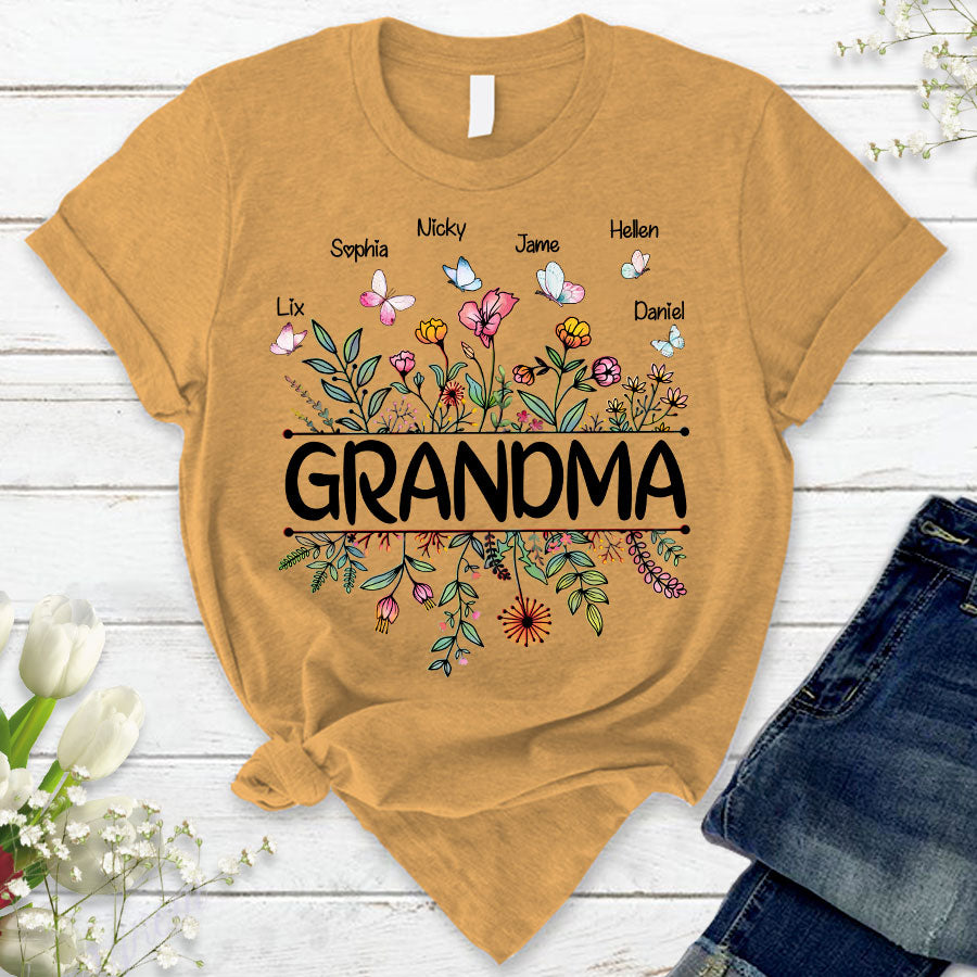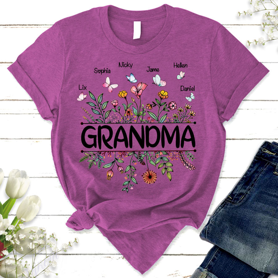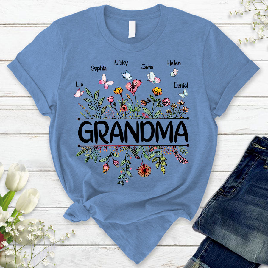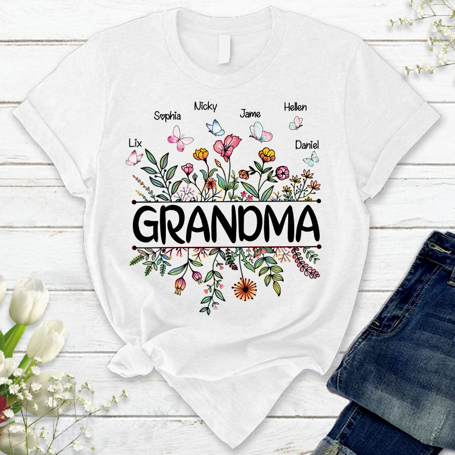 Personalized Grandma With Grandkids Wildflower Watercolor T-Shirt