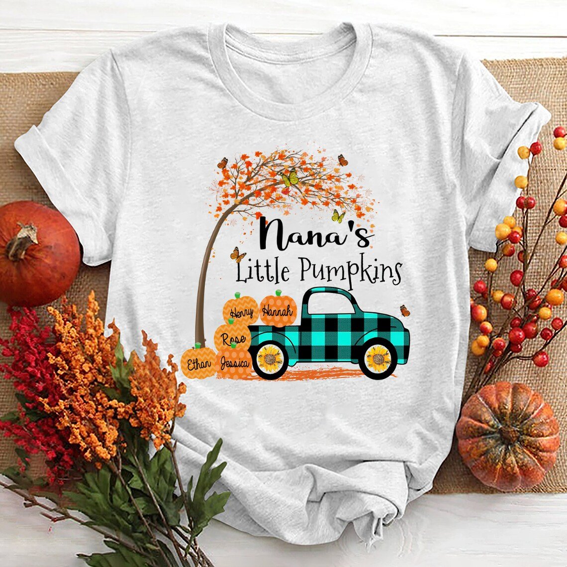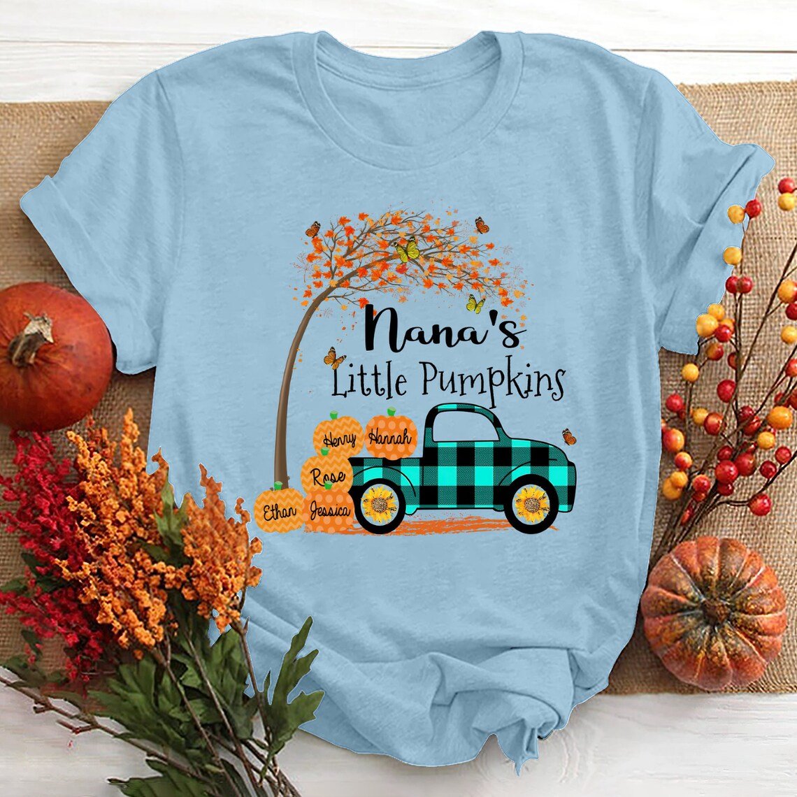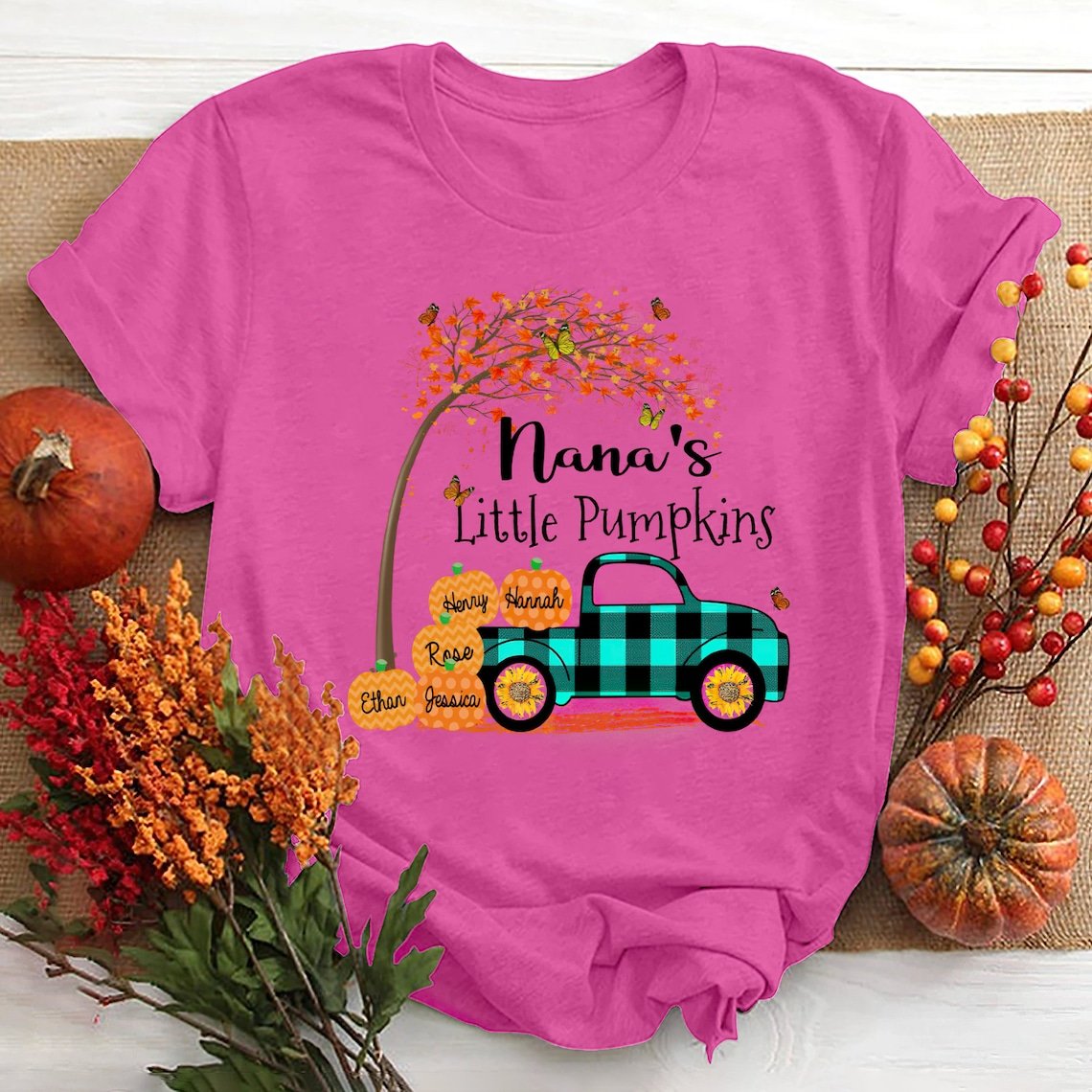 Personalized Grandma’S Little Pumpkins With Grandkids, Autumn Tree And Pickup Truck T-Shirt